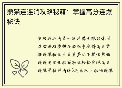 熊猫连连消是一款风靡全球的休闲益智游戏,要想在游戏中取得高分,掌握连爆秘诀至关重要。以下提供熊猫连连消攻略秘籍,助你轻松实现高分连爆。
